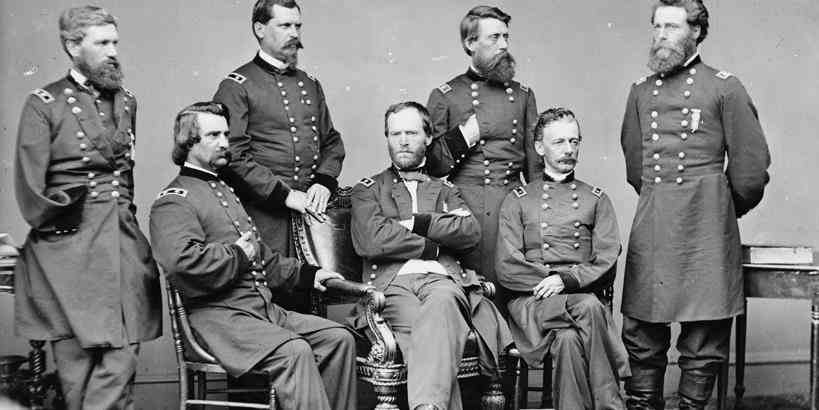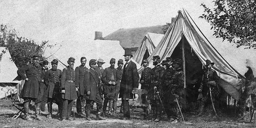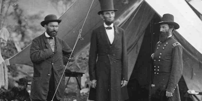 President Abraham Lincoln flanked by Major Alan Pinkteron and General John McClernand at a Union camp in Sharpsburg, Maryland in 1862.